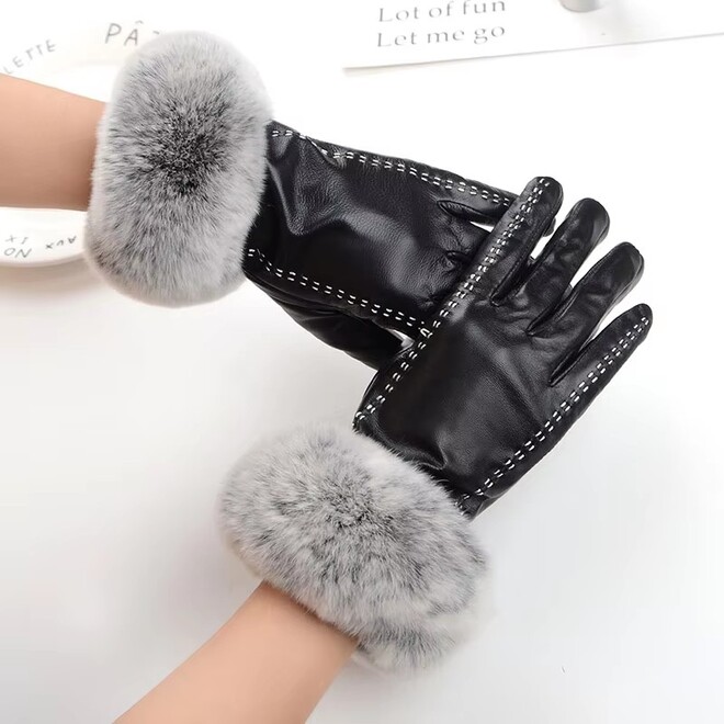 Women Fashionable Sheepskin Mittens Real Leather Gloves With Rabbit Fur